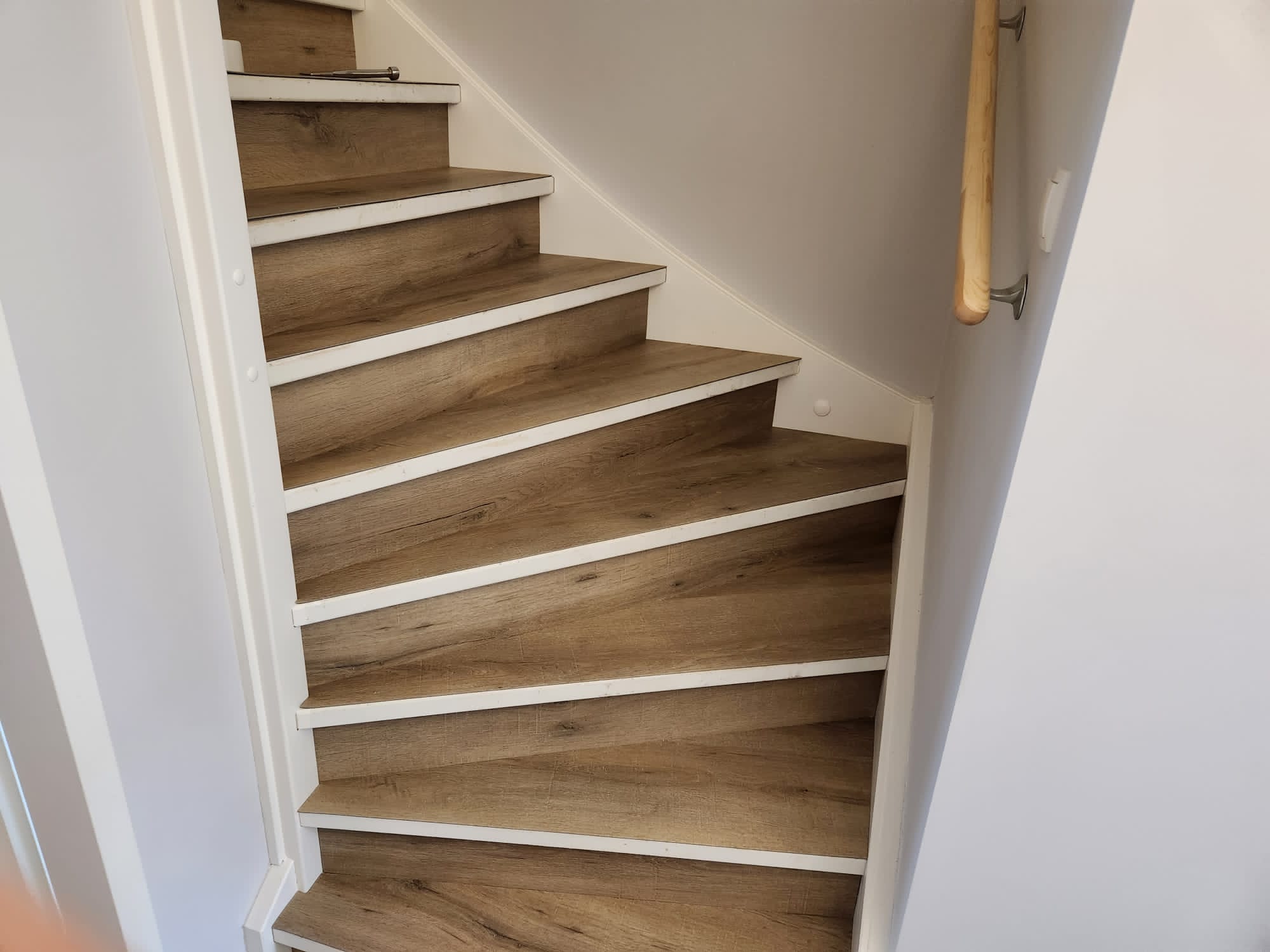 Een mooi afgelakte trap in combinatie met pvc afgewerkte treden geeft een afgewerkte uitstraling. Thuiskomen in een entree met een fraai afgewerkte trap geeft gewoon een fijn gevoel.